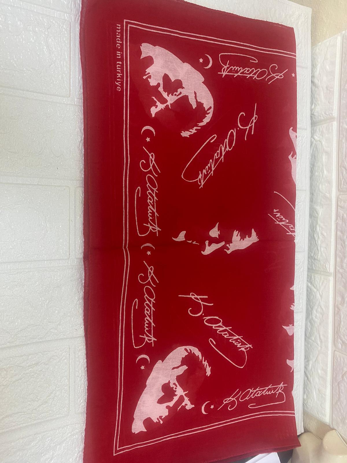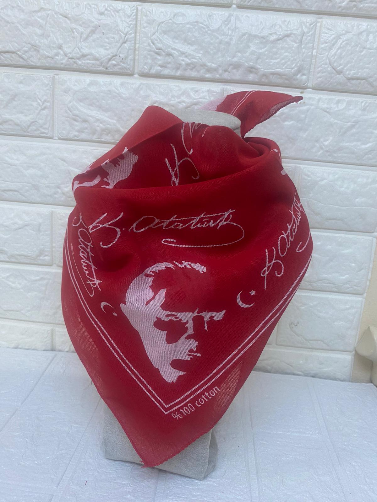 Kırmızı Ay Yıldız ve Atatürk İmzalı Pamuk Kumaş Fular - 23 Nisan, 29 Ekim, 30 Ağustos, 19 Mayıs tarihlerinde resmi günlerde tercih edebilirsiniz. %100 pamuktur. 52 cm*52 cm boyutlarındadır. Her yaşa uygundur. Farklı model ve renkleri mağazamızda mevcuttur.